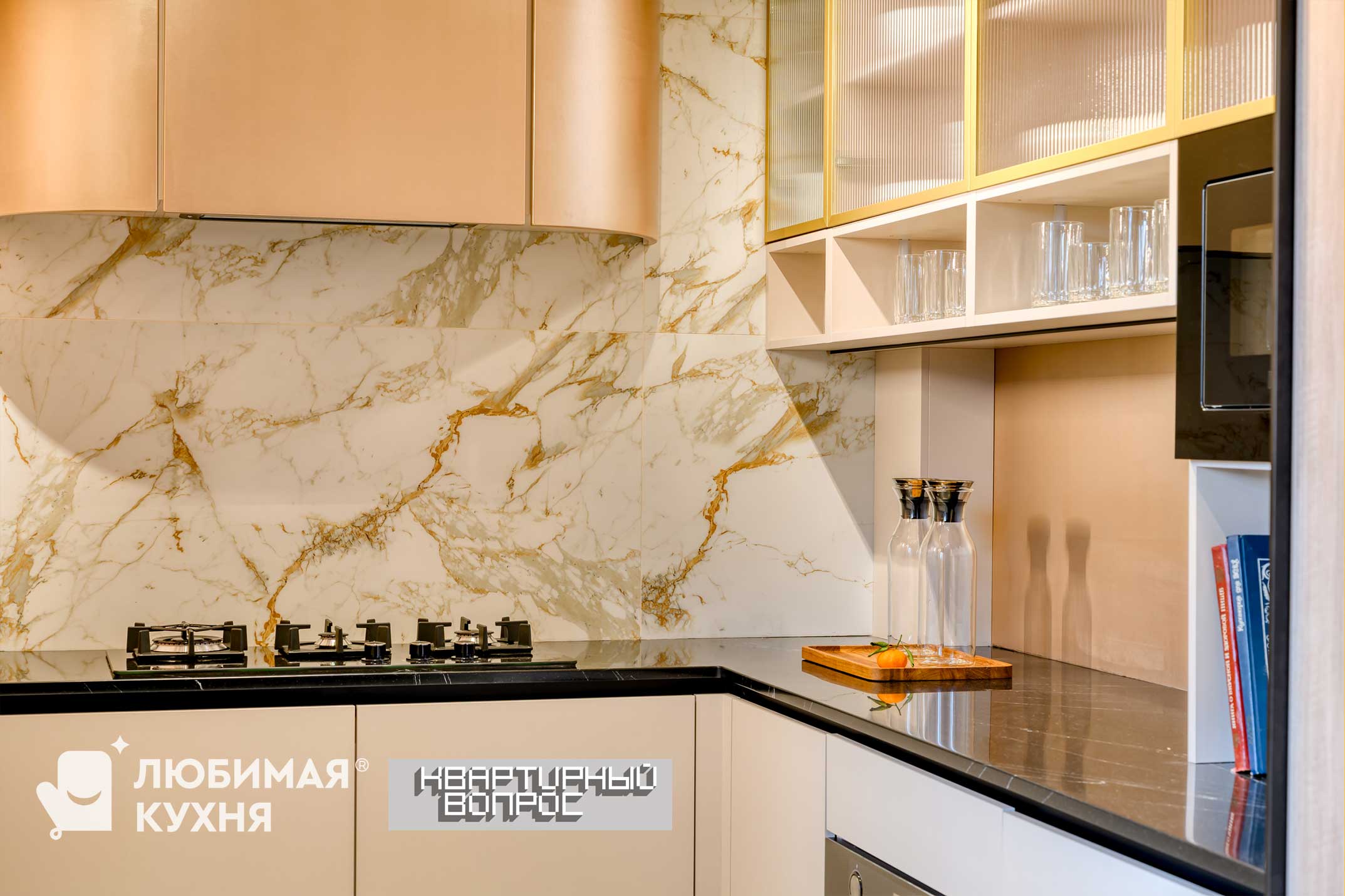 Рисунок мрамора с живописными прожилками называется Creamy Pie, Сливочный пирог — запустим и на кухонный фартук. Для удобства укладки по нижней линии закрепили профиль, он не дает тяжелым плитам сползать.