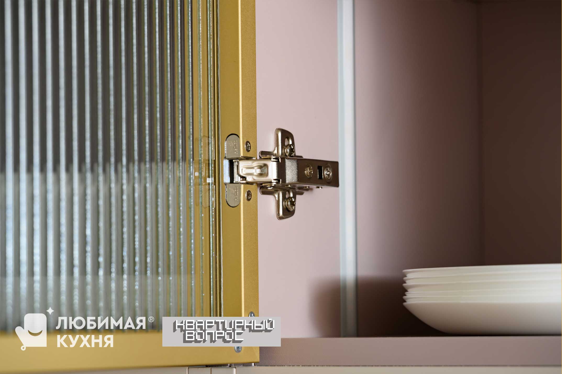 фасады ТРП Монолит беж, фреза Модерн, алюминиевая рамка Золото, стекло Тренд Вирджиния