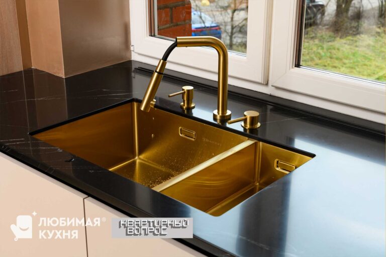 Столешница изготовлена из искусственного камня Grandex. Соединяется он без швов, благодаря чему можно создавать разные формы. Кроме того, над радиатором сделали прорези для выхода теплого воздуха.