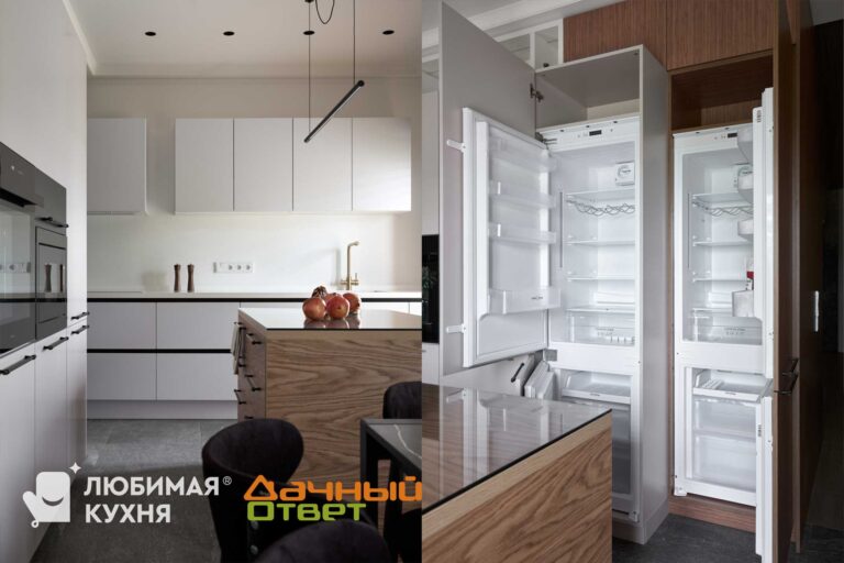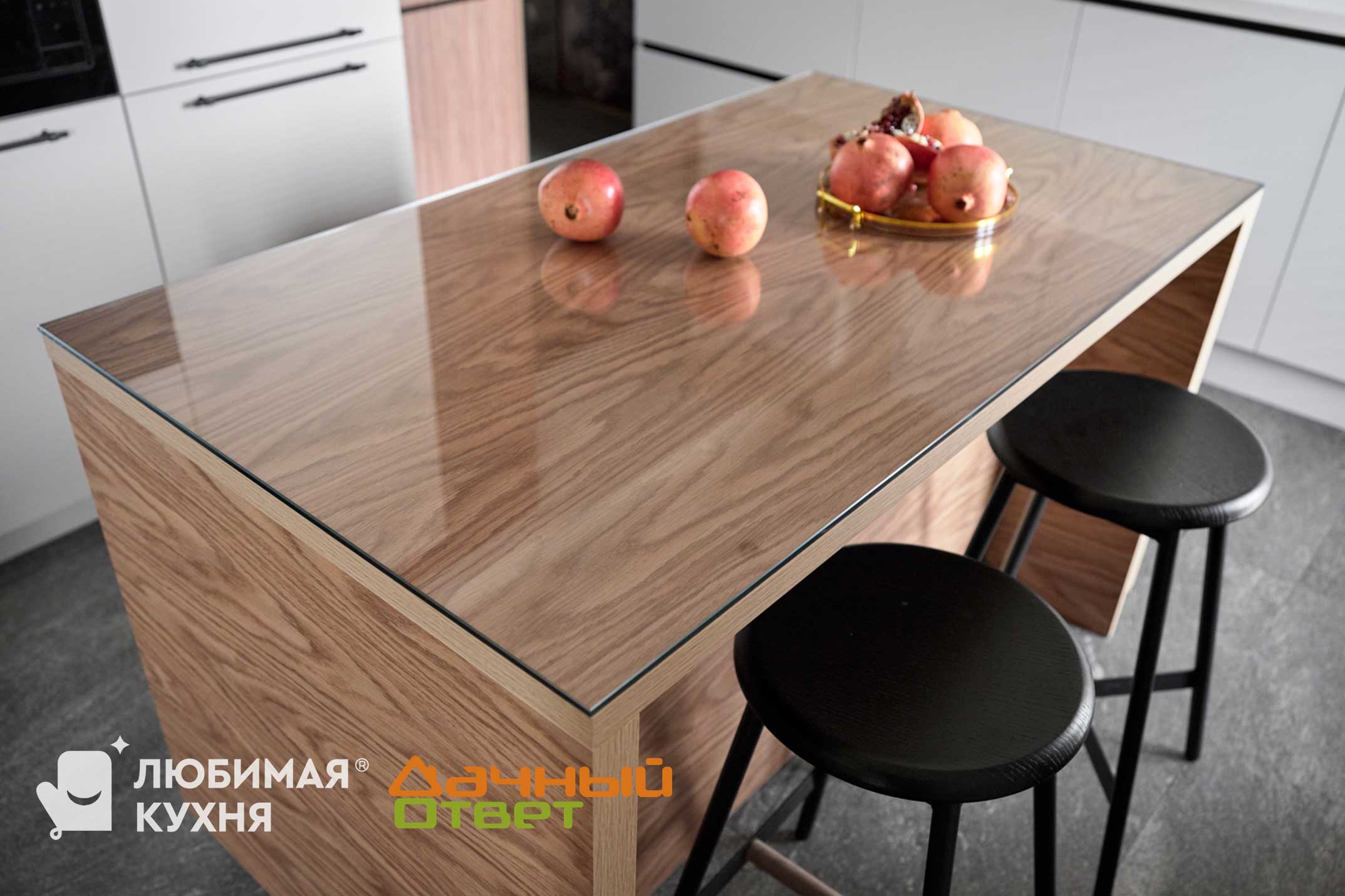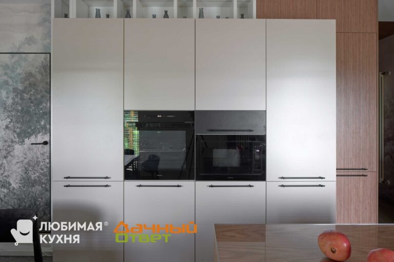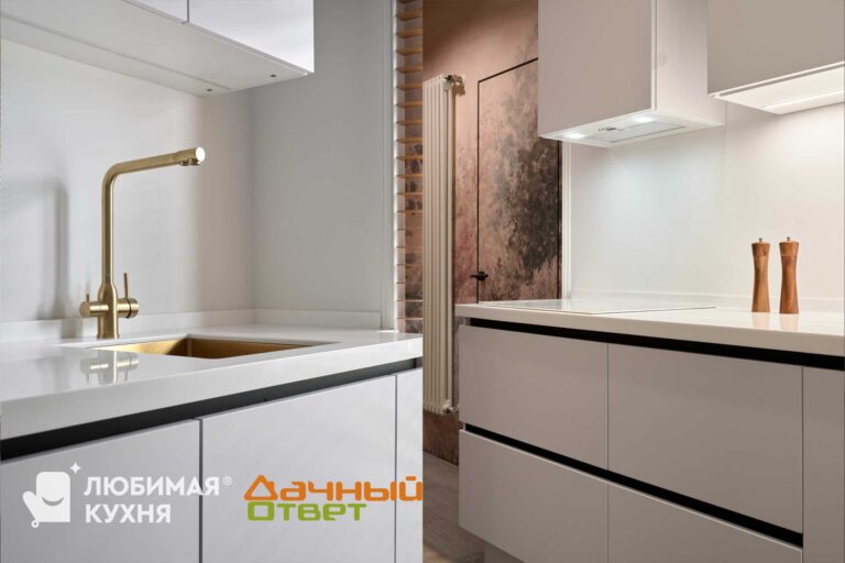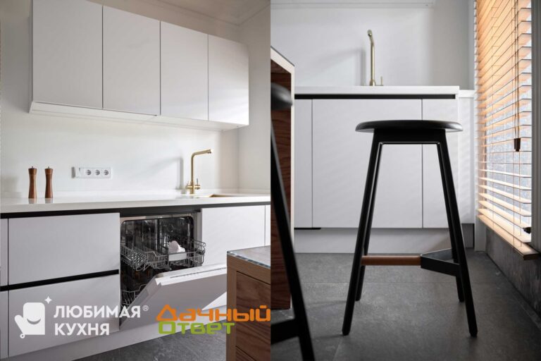 Линейная часть кухонного гарнитура выполнена из ДСП в белой ламинации с черными профильными ручками. Фасады элементов верхнего яруса из МДФ такие же белоснежные, держатся на петлях быстрого монтажа. Наполнение самое разнообразное, с выдвижными корзинами и ящиками-тандемами. Всё – на доводчиках. В центре кухни, как и планировал автор проекта, встает остров. Для его изготовления выбрали ДСП Lamarty в цвете Медея с выраженным рисунком шпона дуба. Производят такую плиту в Сыктывкаре. На ящиках – стильные ручки-скобы. Еще вдоль одной стены вырастают высокие пеналы: один тоже в отделке под дерево, остальные в светло-сером оттенке Тэффи. Сверху и сбоку дополнили их открытыми стеллажными полками. Кухонная столешница выполнена из искусственного камня, в составе которого нет токсичных компонентов. Высоких температур он тоже не боится. Места хранения монтируем и под лестницей, вставляем туда шкафы со скошенной верхней частью. Образовалась целая система полок разного объема.