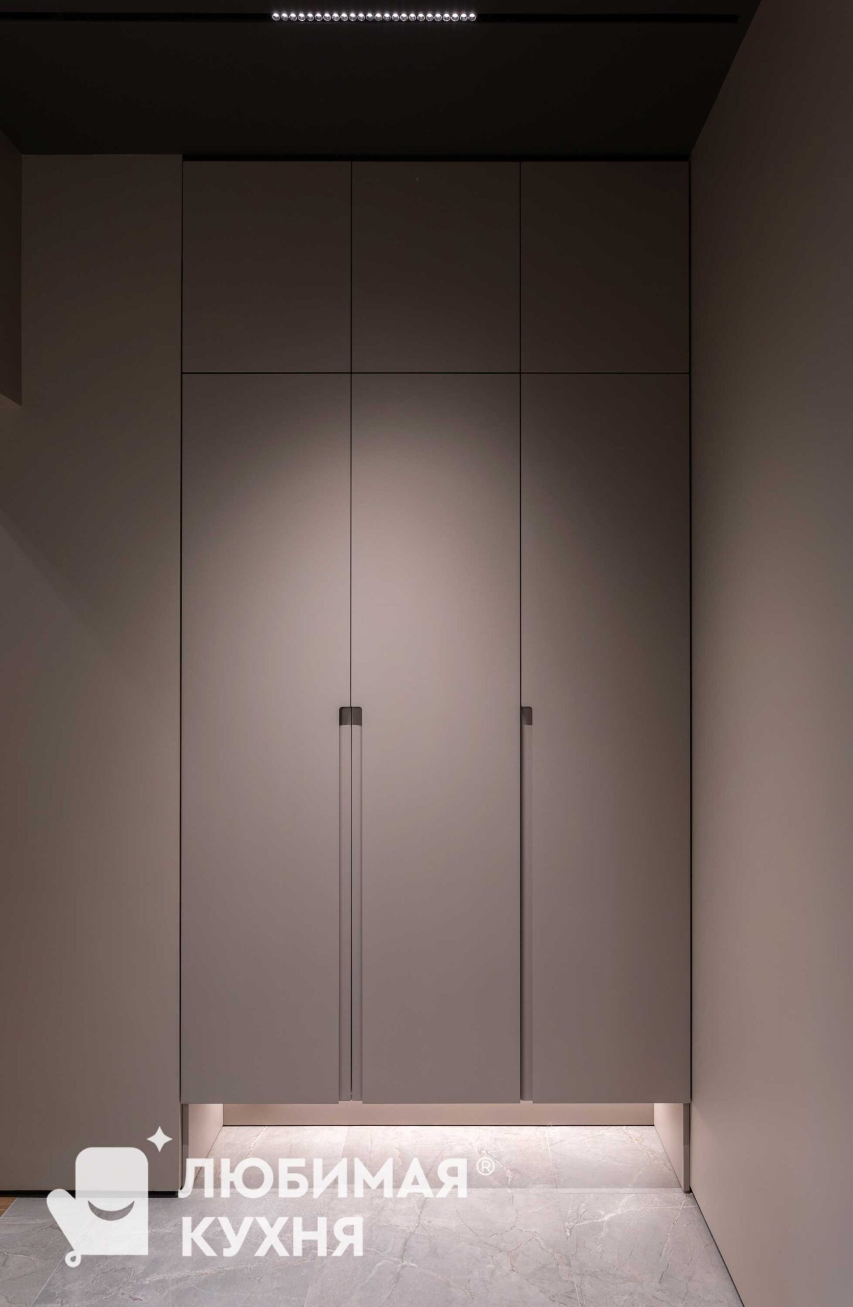 Искусство утонченного минимализма. Серо-коричневые матовые фасады шкафов создают монолитное пространство, сливаясь со стенами. Удобные и стильные ручки, которые вырезаны в фасадах и создают дополнительный ритм. Фишкой данного шкафа является его подвесная конструкция, которая образует пространство под шкафом с подсветкой для размещения обуви.