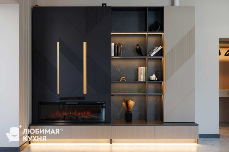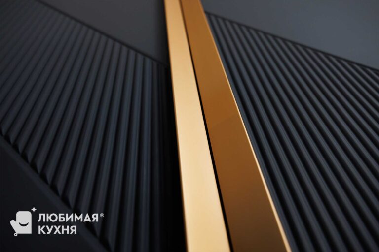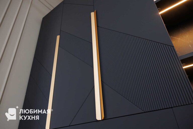 Функциональная мебель для постирочной в элегантном серо-юежевом оттенке с рифлеными фасадами. Компактная система объединяет зону стирки со встроенной стиральной машиной, открытые полки с подсветкой для хранения средств, выдвижной ящик и вешалку для сушки белья. Жалюзийные фасады на правой стороне обеспечивают вентиляцию, а золотистые ручки и фурнитура добавляют изысканности. Продуманное освещение делает пространство удобным для использования в любое время суток.
